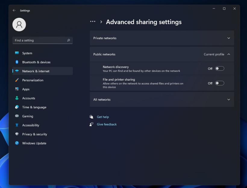 在 Windows 11 Build 22509 中,你将在 Windows 设置应用程序的一个新页面上找到高级共享设置。网络发现、文件和打印机共享以及公共文件夹共享等功能现在将出现在名为高级共享设置的页面下。