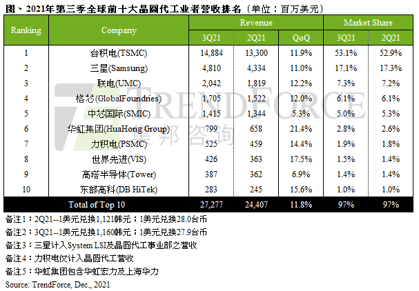 2021 年第三季度全球晶圆代工厂营收排行:台积电、 三星、联电、格芯、中芯国际前五