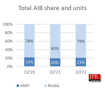 JPR 总裁 Jon Peddie 博士指出:“英特尔准备在 2022 年进入 AIB 市场。目前还不清楚该公司是否会像 AMD 和英伟达那样销售 AIB,还是只提供芯片。”