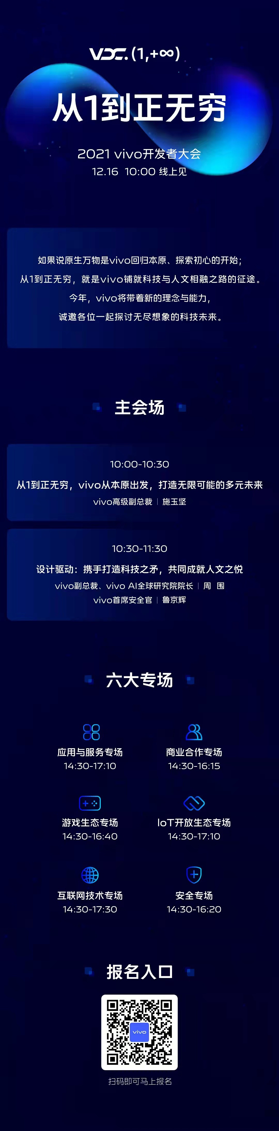 12 月 6 日消息,vivo 正式宣布 2021 开发者大会将于 12 月 16 日上午正式召开,主题是“从 1 到正无穷”,设有 1 个主会场、6 个专场,整体将采用线上直播的方式。