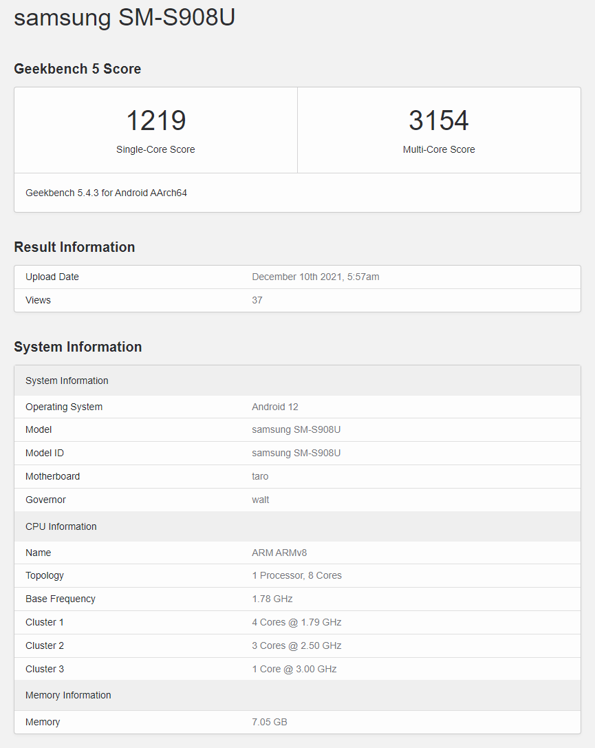 三星 Galaxy S22 Ultra 在 Geekbench 曝光:8/12GB 内存,跑分超骁龙 888