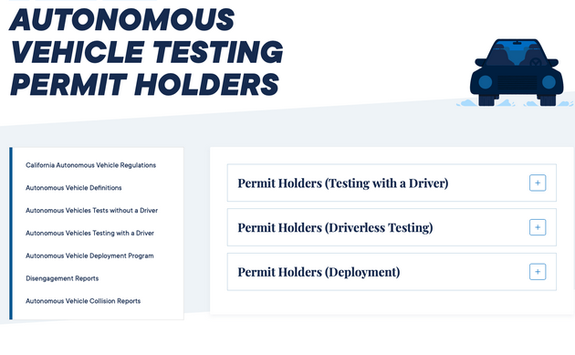 加州交管局网站显示,他们目前发放的自动驾驶 (Autonomous Vehicle) 测试牌照包括三大类。第一类是有人自动驾驶牌照 (Testing with a Driver),安全员可以在紧急情况下接管车辆。第二类则是全无人自动驾驶测试牌照,无人车可以在主驾驶位没有安全员的情况下上路测试,意味着汽车自动系统在特定环境下完全处于无人驾驶模式,驾驶位上没有人。