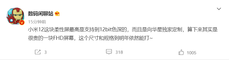 今日 @数码闲聊站 爆料称,小米 12 的这块柔性屏是向华星光电独家定制的型号,最高支持 12bit 色深,屏幕尽管为 FHD 分辨率,但是成本很高。