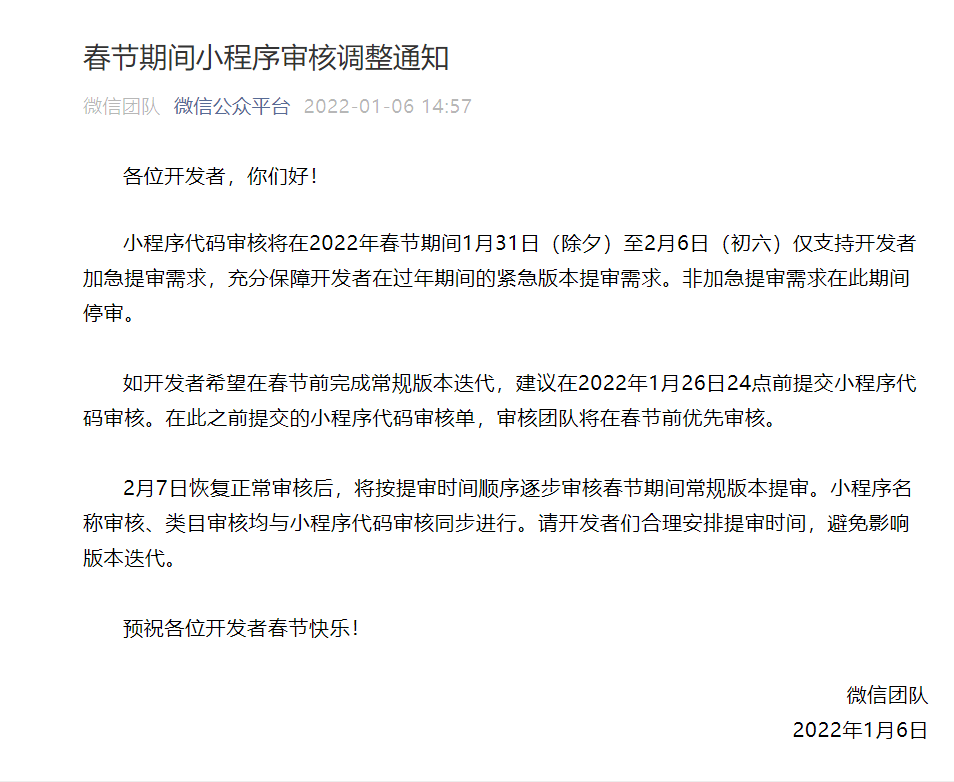 如开发者希望在春节前完成常规版本迭代,建议在 2022 年 1 月 26 日 24 点前提交小程序代码审核。在此之前提交的小程序代码审核单,审核团队将在春节前优先审核。