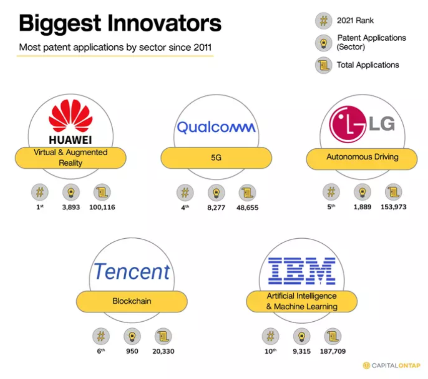 Capital on Tap 统计的专利方向包含人工智能、量子计算、自动驾驶汽车、5G、虚拟和增强现实(VR / AR)、网络安全等。