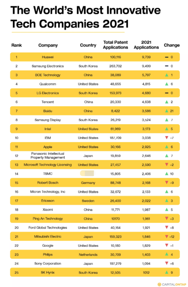 1 月 9 日消息,Capital on Tap 研究了超过 260 万件专利申请,对 2021 年科技公司提交的申请数量与上一年进行了比较,推出了 2021 年全球最具创新性的科技企业排行榜。