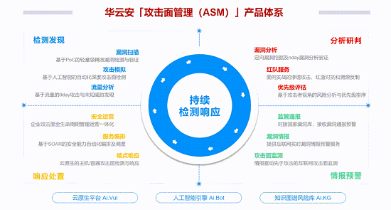 华云安认为攻击面管理(Attack Surface Management, ASM))既是新兴技术,也是一个新兴的方法论,是一个天然的技术融合架构。因而基于多年的网络安全漏洞研究与人工智能赋能攻防的技术实践,华云安推出国内首个完整的攻击者视角的安全运营一体化解决方案,为用户提供一系列完整的攻击面检测和管理解决方案。作为攻击面管理(ASM)框架的最佳实践,华云安从检测发现、分析研判、情报预警、响应处置和持续监控,实现攻击面的持续检测响应能力。