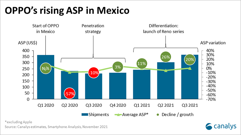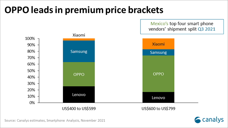 OPPO 在 2021 年第三季度,已成为墨西哥第四大手机厂商,市场份额 12%,出货量同比增长数十倍。根据 Canalys 统计,在 400-799 美元价位段,OPPO 手机的占有率获得了冠军。