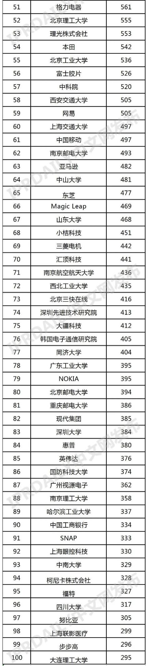 此外,APPLE、京东方、VIVO、海康威视、西安电子科技大学、联想、东南大学、武汉大学、中科院、汇顶科技、大疆科技等也成功跻身 TOP100 排行榜。