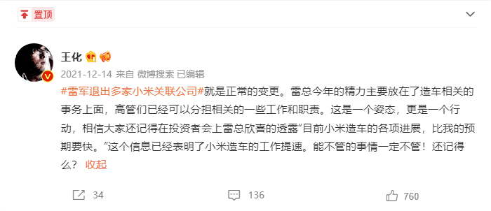 针对网络上的评论,小米王化再次转发 2012 年 12 月 14 日的微博。雷军于 2021 年便退出了多家关联公司的领导席位,王化表示这是正常的变更,雷军的精力主要放在了造车相关的事务上面,高管们可分担他此前的工作。