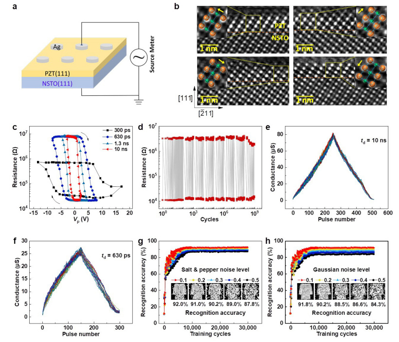李晓光教授团队制备了高质量的铁电隧道结,通过 PZT(压电陶瓷驱动器)超薄厚度和取向的设计,获得了更小的铁电畴和更连续的翻转动力学行为,更丰富的铁电多畴亚稳态利于类脑突触器件中多态的可控调节。该器件表现出优异的综合性能:其 8 比特线性电导调控和高耐久性,满足类脑突触器件的核心性能指标要求。基于该器件性能仿真构建的神经网络具有高图像识别率,即使在图片中引入椒盐噪声或高斯噪声,其识别图片的准确率仍然大于 85%。此外,该器件具有亚纳秒超快操作速度,而且其能耗低至飞焦级。研究人员经过推算表明,该铁电隧道结构建的神经网络计算系统,有可能实现相当于人脑的优秀能效,而人脑神经元突触单次脉冲能耗约 10 飞焦。人脑突触响应速度约亚毫秒,其响应速度也比人脑突触快 6 个量级,堪称媲美人脑突触的能效表现。