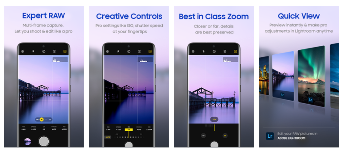 这款应用程序可以让用户使用 Pro 模式,充分利用三星 Galaxy S21 Ultra 的主摄、超广角、3x 长焦和 10x 长焦摄像头,用户可以获得曝光、对焦、ISO、快门速度和白平衡控制,还可以让你调整高光、阴影、饱和度和色调。用户可使用直方图,并可以将图像保存为无损 JPG 和 16 位线性 DNG RAW 格式。