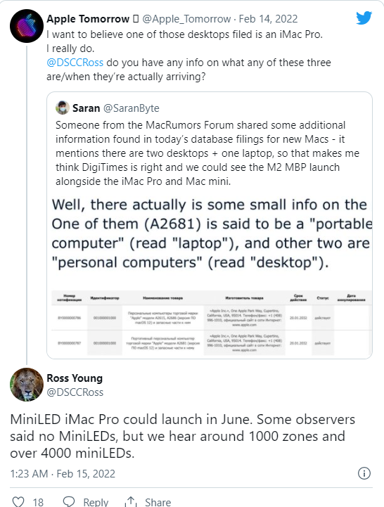 曝苹果全新 Mini-LED iMac Pro 2022 款将在今年 6 月发布:屏幕大约 1000 个亮度区域