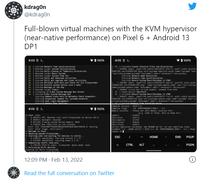 据 XDA 高级成员 kdrag0n 最新测试,谷歌 Pixel 6 在安装 Android 13 首个开发者预览版后,成功运行了 Win11 Arm 虚拟机。