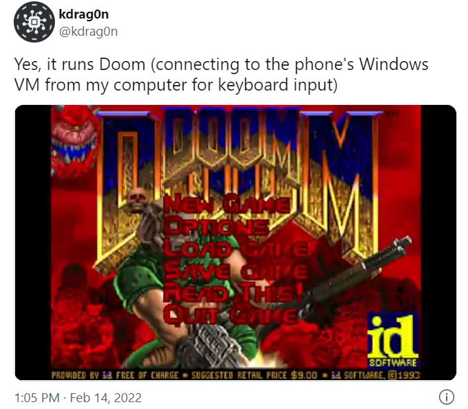 kdrag0n 甚至在手机上玩起了《毁灭战士》,这款 1993 年的老游戏运行起来毫无压力。