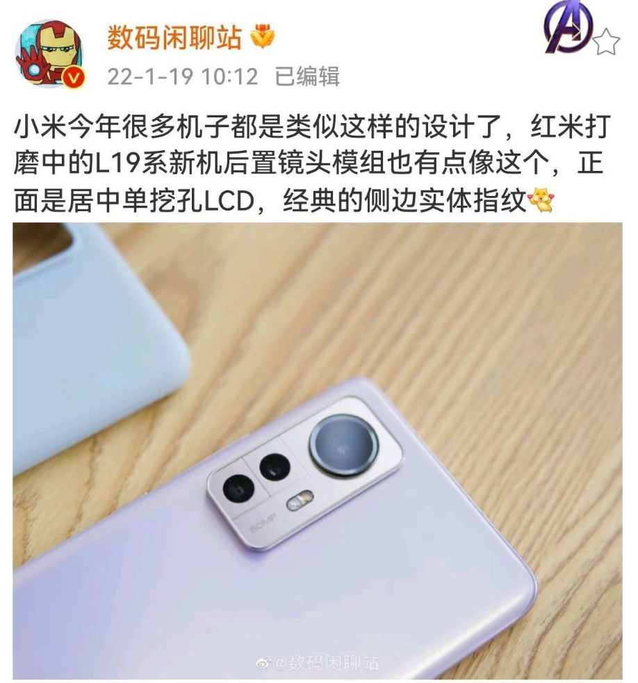 据数码博主 @数码闲聊站 此前的爆料,Redmi 正在打磨 L19 系新机,后置镜头模组类似小米 12 系列,正面居中单挖孔 LCD 屏,配备侧边实体指纹识别键。