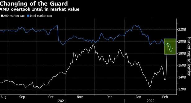 英特尔股价周二下跌 0.8%,报收于每股 44.69 美元,市值为 1820 亿美元。上周 AMD 收盘市值首次超过英特尔。