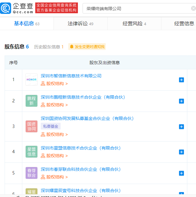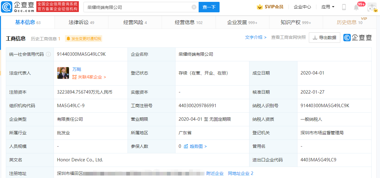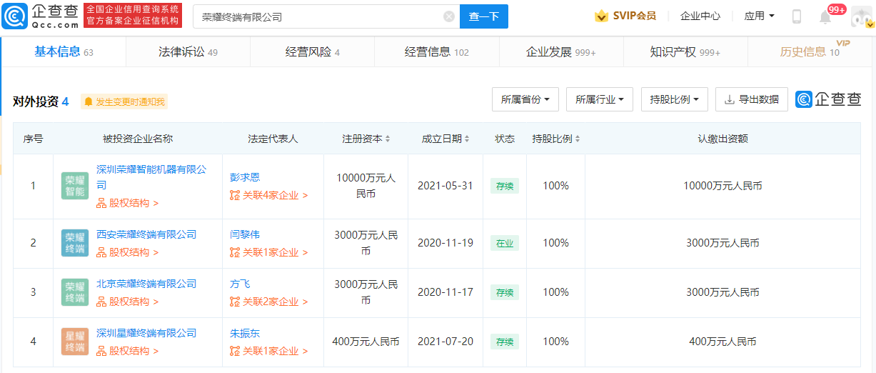企查查 App 显示,荣耀终端有限公司成立于 2020 年 4 月,法定代表人为万飚,注册地位于深圳市福田区。2020 年 11 月,华为投资控股有限公司退出该公司股东行列。企查查 App 显示,荣耀终端有限公司当前对外投资企业共 4 家,注册地分布在深圳、西安、北京三地。