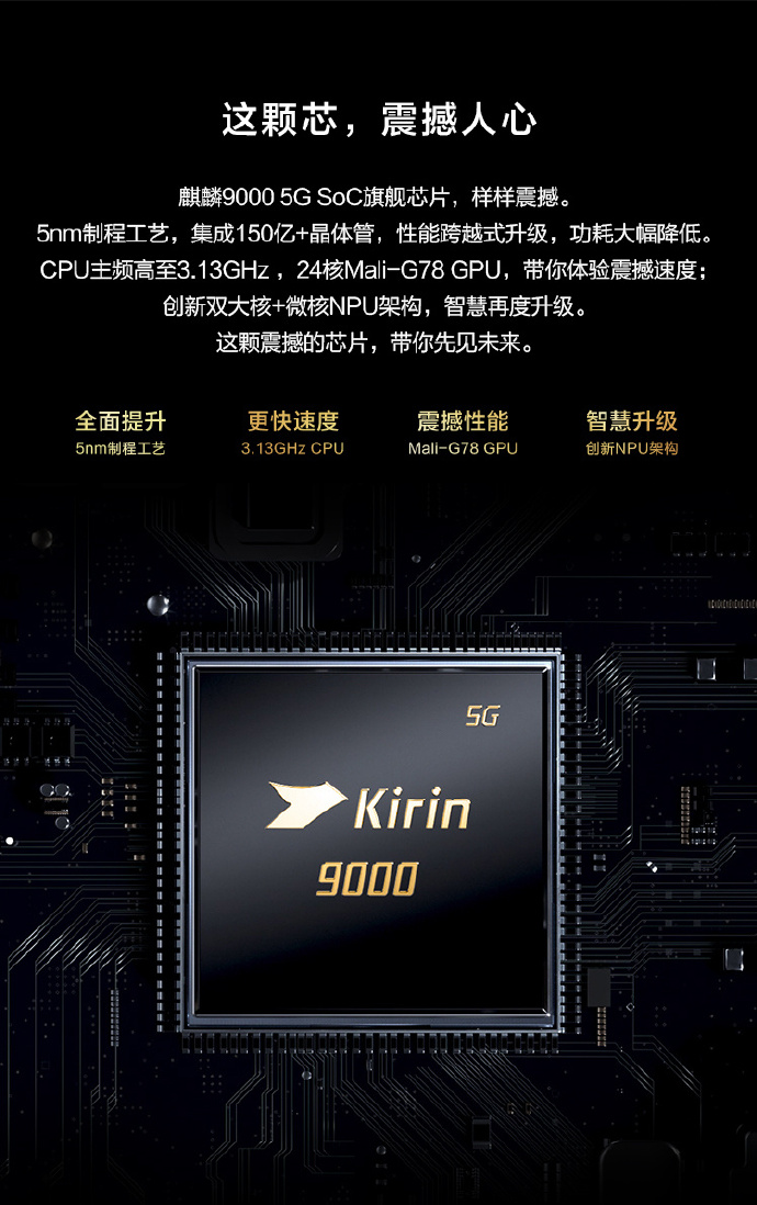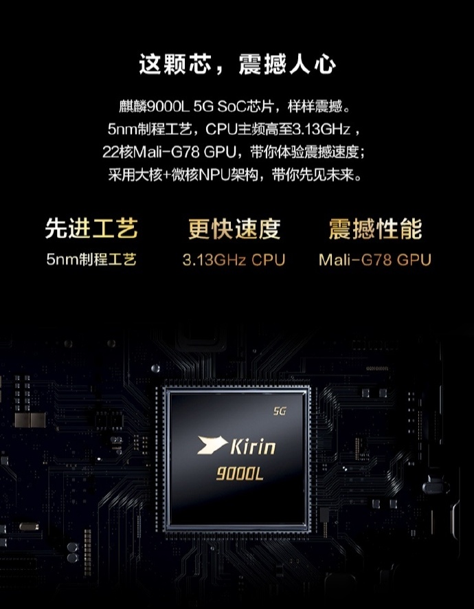华为 Mate40E Pro 相比 Mate40E 最大的变化是处理器换成台积电代工的六核 5nm 的麒麟 9000L 5G,采用 1*3.13GHz A77+2*2.54GHz A77+3*2.05GHz A55,辅以 Mali-G78 MP22 GPU,该处理器对比麒麟 9000 少了 2 个 GPU、1 个大 NPU,还少了两个 CPU,变成了六核处理器。