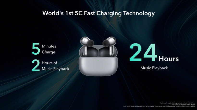 续航方面,Earbuds 3 Pro 支持 5C 快充技术,号称充电 5 分钟,音乐播放 2 小时。结合耳机充电盒充电,可支持 24 小时音乐播放。
