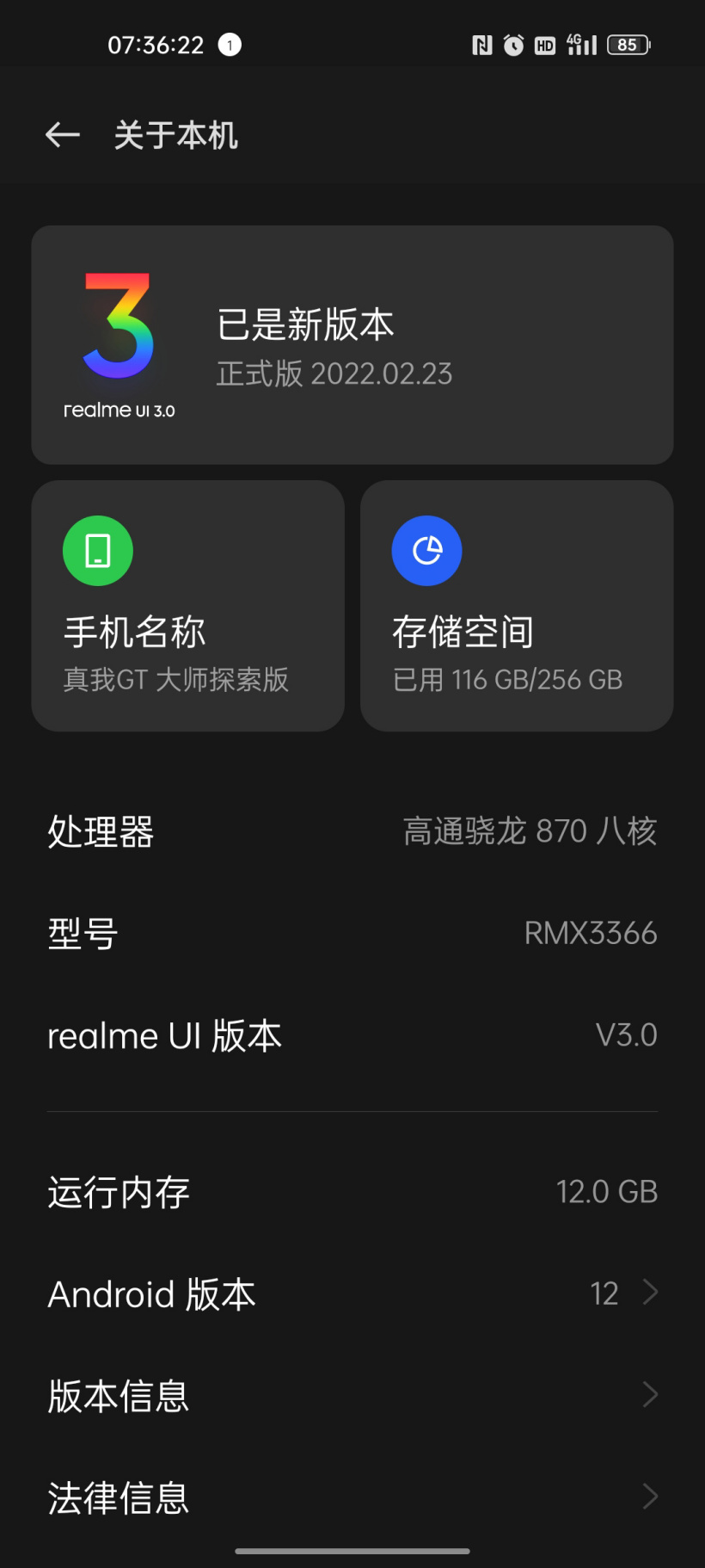 据网友投稿,realme 真我 GT 大师探索版已推送 realme UI 3.0 正式版,基于 Android 12 系统。