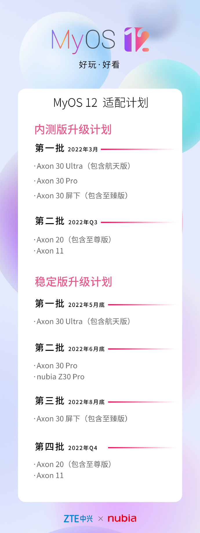 MyOS 12 系统升级适配计划包含内测版和稳定版,内测版升级计划第一批为 2022 年 3 月,包含 Axon 30 Ultra (包含航天版) 、Axon30Pro、Axon30 屏下 (包含至臻版);第二批为 2022 年 Q3,包含 Axon20 (包含至尊版)、Axon 11。稳定版升级计划第一批 为 2022 年 5 月底,包含 Axon 30 Ultra (包含航天版) ;第二批为 2022 年 6 月底,包含 Axon 30 Pro、nubia Z30 Pro;第三批为 2022 年 8 月底,包含 Axon30 屏下 (包含至臻版);第四批为 2022 年 Q4,包含 Axon20 (包含至尊版)、Axon 11。
