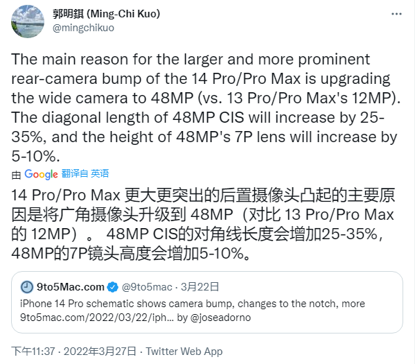 郭明錤:苹果 iPhone 14 Pro / Max 升级了更大的 48MP 传感器所以镜头会更凸