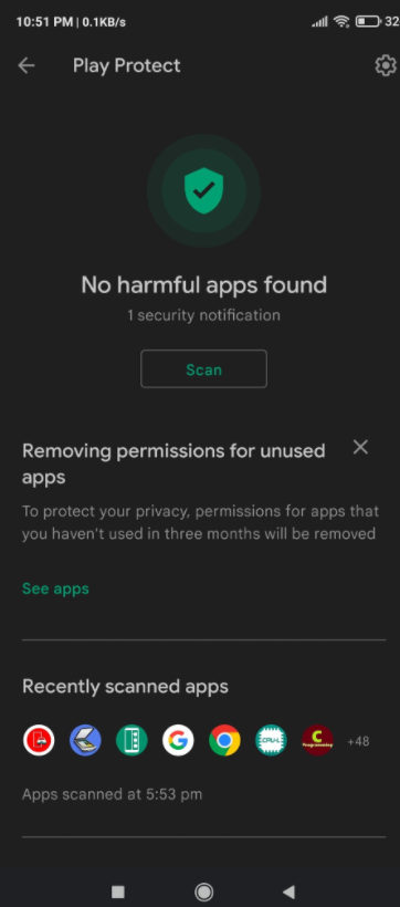 从下图可以看到,一旦该功能可用,用户就会在 Play Protect 设置中看到新的“未使用 App 的权限”选项。