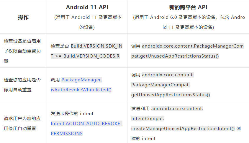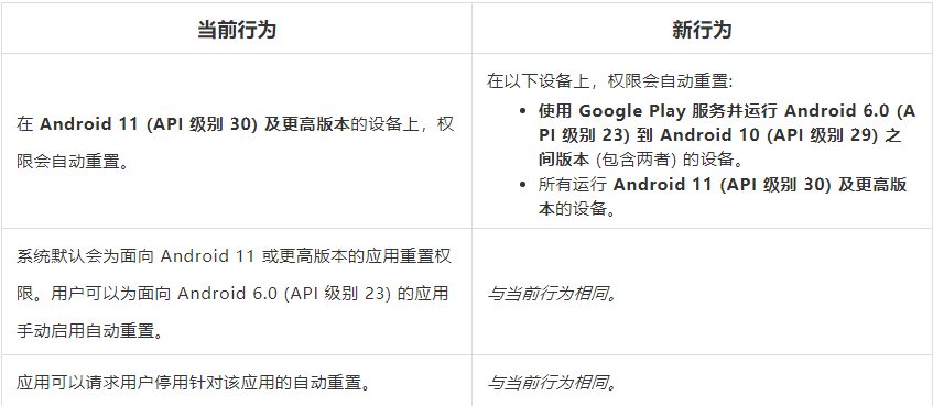 对于开发者来说,如果一个 App 面向 API 30 及更高版本,并请求用户停用权限自动重置,那么开发者需要做一些简单的代码更改。