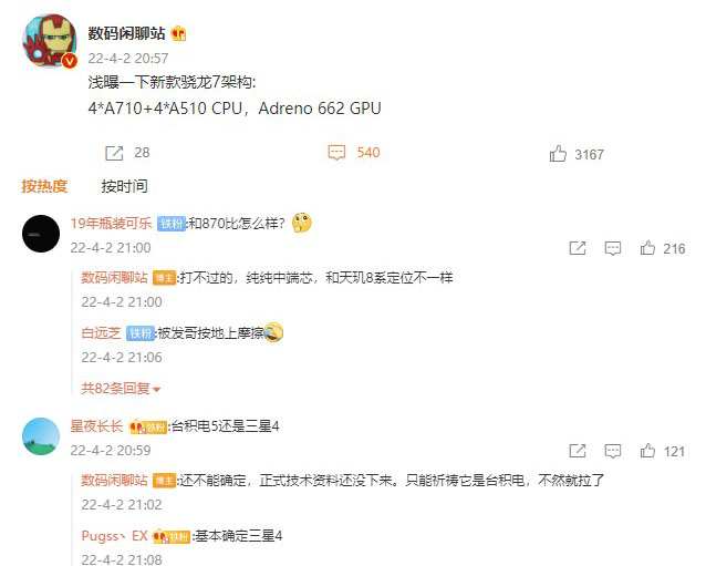 据数码博主@数码闲聊站爆料,高通今年的中端芯片骁龙7采用“4+4”架构,CPU采用4颗A710大核+4颗A510小核,GPU采用Adreno662。