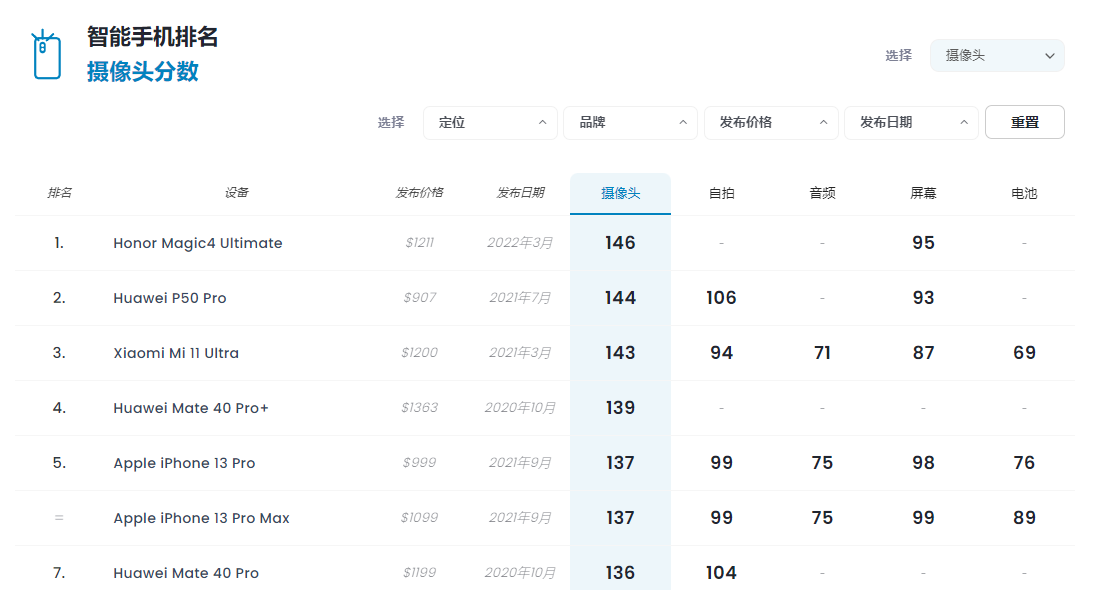 目前小米 DXOMARK 上的最强拍照机型依然是小米 11 Ultra,以 143 分的成绩位列第 3,距离第一只有 3 分的差距。
