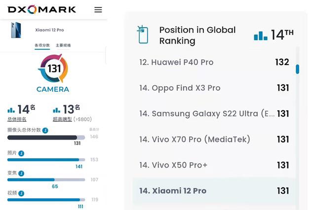 小米 12 Pro DXOMARK 相机成绩出炉:131 分位列第 14 名