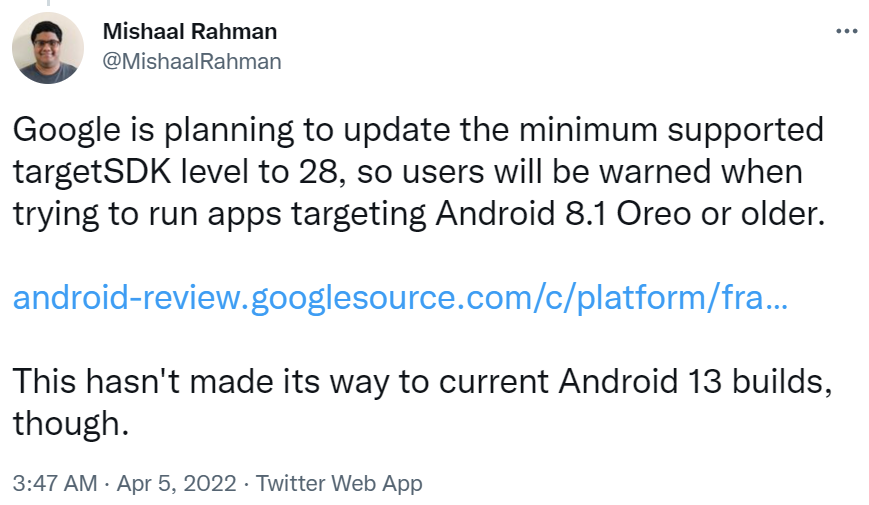 根据更新的要求,当用户尝试运行以 Android 8.1 Oreo 或更早版本为目标的应用时,Android 将开始警告用户。但是,此更改也尚未应用于当前的 Android 13 版本。