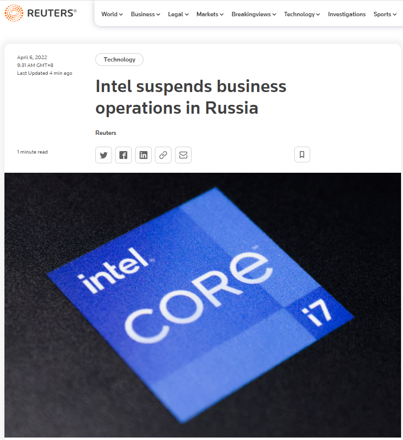 3 月 3 日英特尔已经宣布暂停向俄罗斯和白俄罗斯客户的发货。