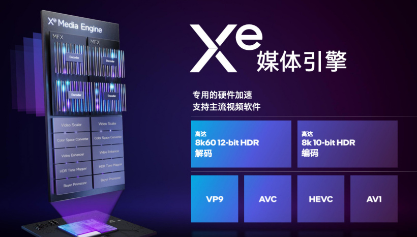 英特尔 Xe 媒体引擎支持最高 VP9、AVC、HEVC 和 AV1 硬件编解码,最高支持 8k60 12bit HDR 解码和 8k 10bit HDR 编码。