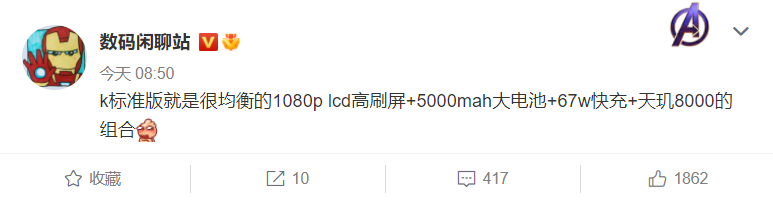 微博博主 @数码闲聊站 爆料称,K10 标准版搭载均衡的 1080P LCD 高刷屏,内置 5000mAh 电池,67W 快充,天玑 8000 芯片。