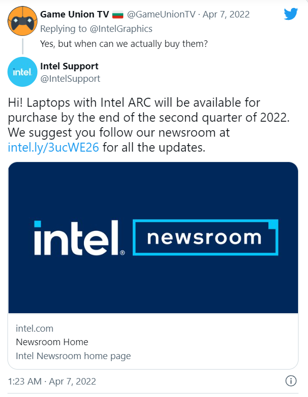 根据英特尔支持官方账号的消息,英特尔 Arc 笔记本电脑将在第二季度末上市,目前尚不清楚是否也包含 Arc 3 系列。