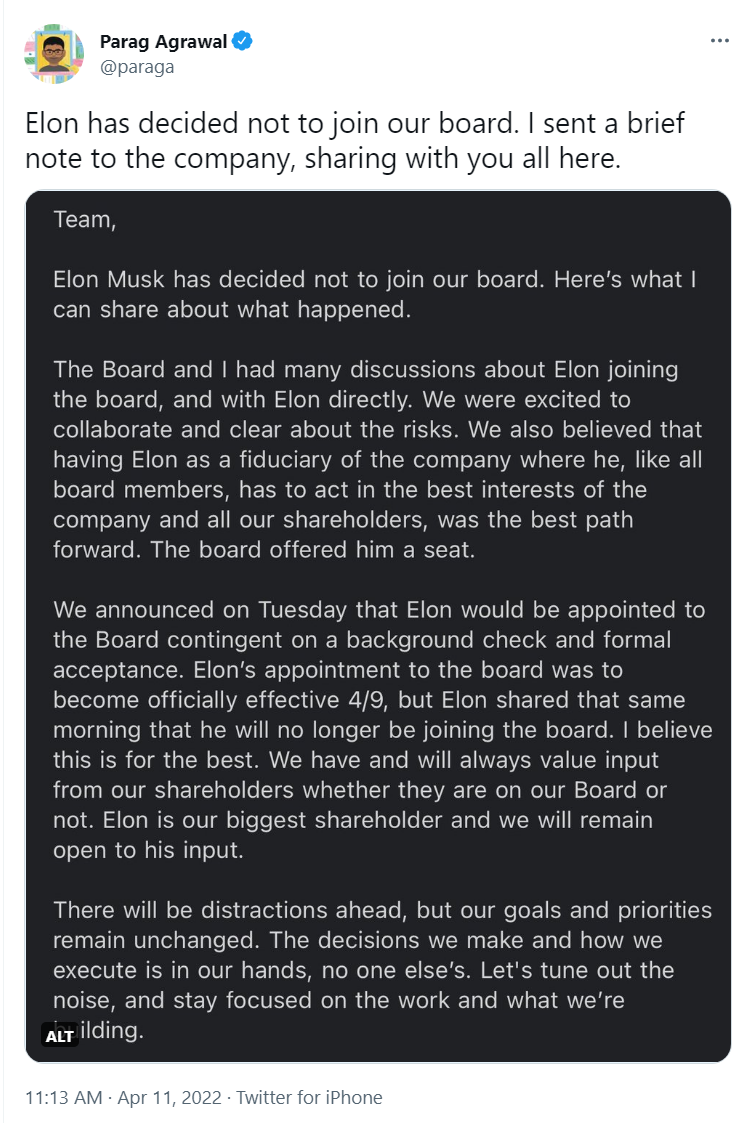 特斯拉 CEO 埃隆-马斯克已经决定,他将不会加入 Twitter 董事会,这一消息是由 Twitter 首席执行官 Parag Agrawal 给出的。
