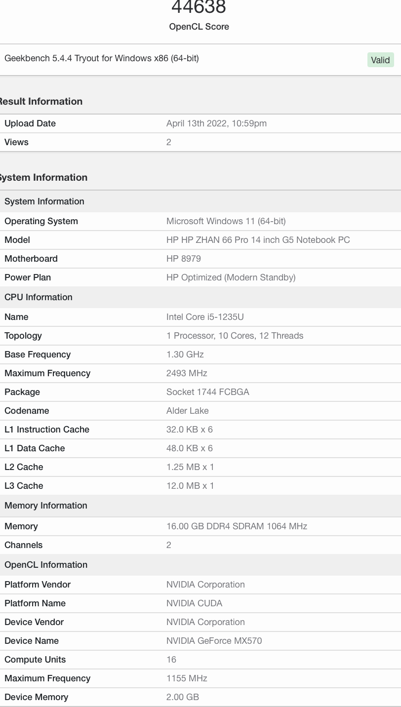 搭载 MX570 独显的惠普战 66 笔记本现已现身 Geekbench,OpenCL 跑分 44638,比 RTX 2050 稍低。
