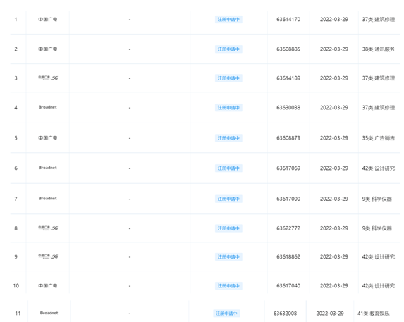 该公司成立于 2014 年 4 月,法定代表人为宋起柱,注册资本约 53.8 亿人民币。知识产权信息显示,该公司已于近期申请注册多个“中国广电 BROADNET 5G”“中国广电 CHINA BROADNET 5G”等商标,国际分类涉及通讯服务、广告销售、教育娱乐等,当前商标状态均为等待实质审查。