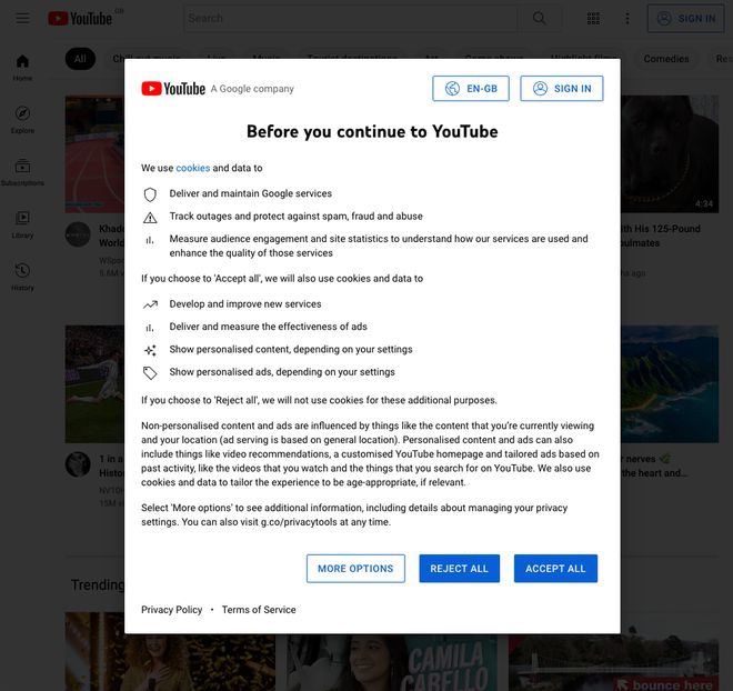 为了解决这个问题,谷歌的新 Cookie Rejection Banner 提供了清晰、平衡的选择,包括了“拒绝所有”(reject all)、“接受所有”(accept all)或“更多选项”(more options)等按钮。如果用户没有登录账号,新菜单将出现在谷歌搜索和 YouTube 上。