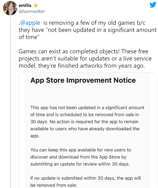 “您可以通过在 30 天内提交更新以供审核,让新用户可以从 App Store 发现和下载此 App,”苹果在电子邮件中写道。“如果在 30 天内没有提交更新,该 App 将被下架。”